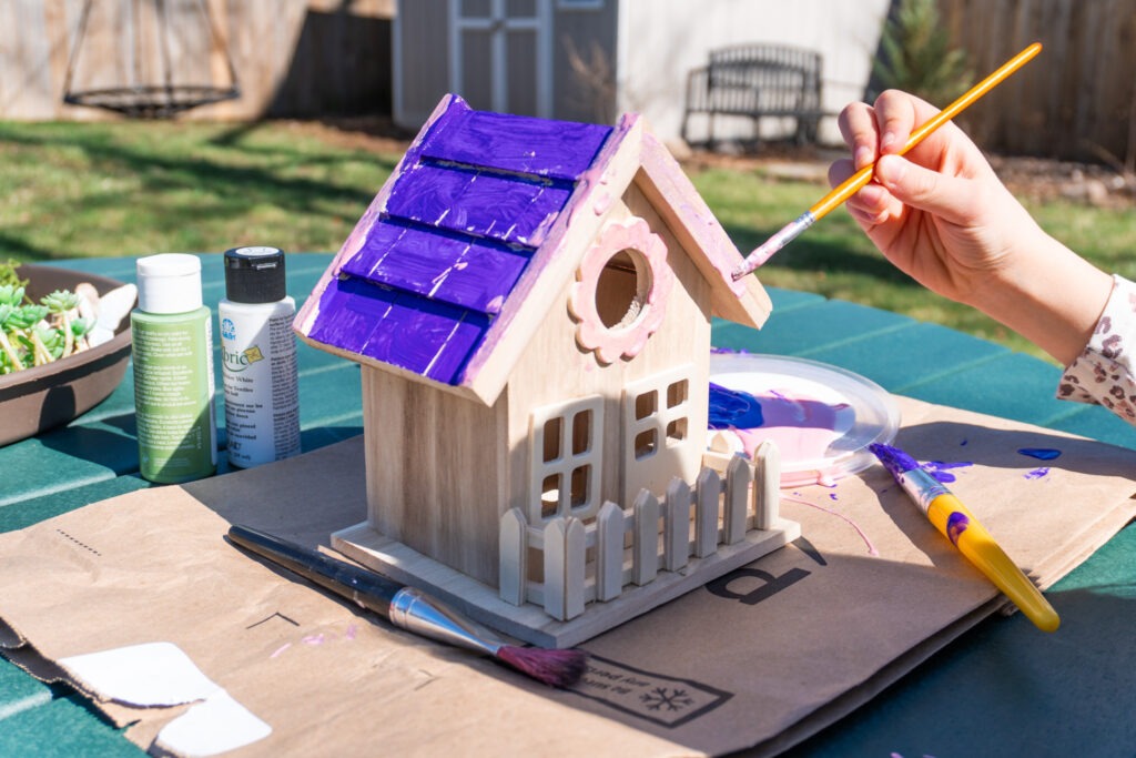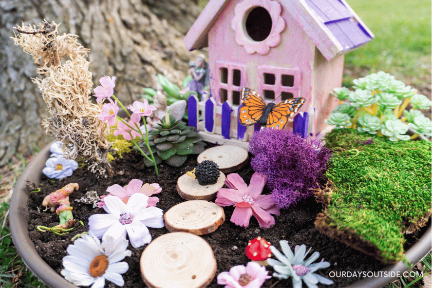 Just like choosing a container, there are endless possibilities when picking a home for your fairies! You can buy a wooden bird house and decorate it yourself or create your own from scratch with nature materials like twigs and bark. My daughter really enjoyed being able to paint hers pink and purple, but I’ve also created one using an old can with some twigs and moss covering it. It’s totally up to you how creative you want to get! Here are fairy home some options: