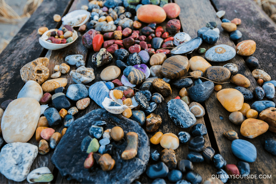 Rocks are everywhere and kids love collecting them! We live near the great lakes and love collecting rocks every time we go to the beach! Wherever you are, encourage your child to gather rocks from different places and sort them by color, size, or texture.