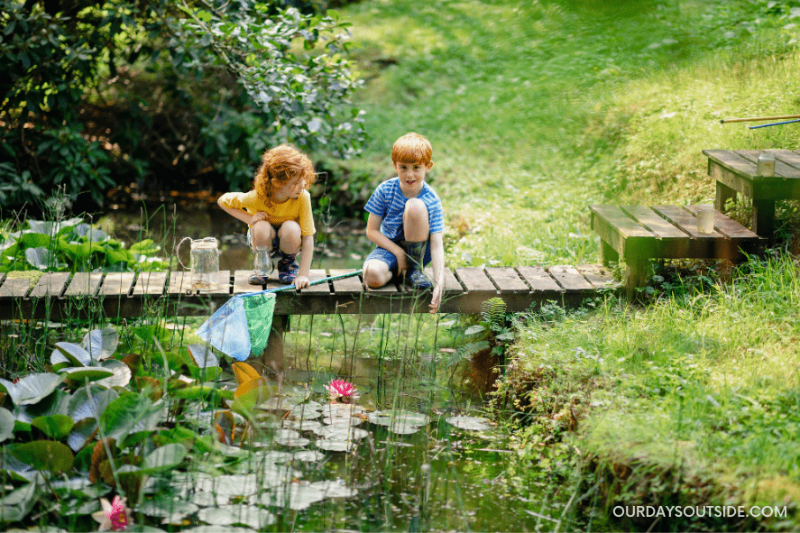 Visit a local pond or wetland with a net and container. Scoop up water to observe tiny organisms, tadpoles, or water beetles. Look at a sample of water under a portable microscope. Talk about the pond as a living ecosystem. Read the book Over And Under The Pond. Nature study ideas like this one encourages ecological awareness and inquiry-based learning.