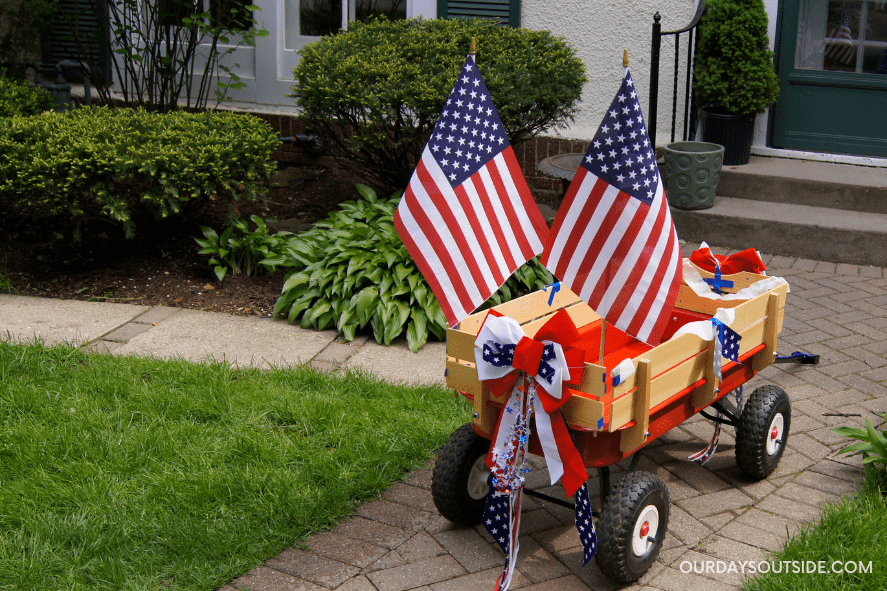 Encourage kids to decorate their bikes, scooters, and wagons with flags, streamers, and bunting, then ride through the neighborhood! Try these red, white, and blue handlebar streamers, mini American flags, and patriotic bows. Bonus if you play patriotic music as you ride!