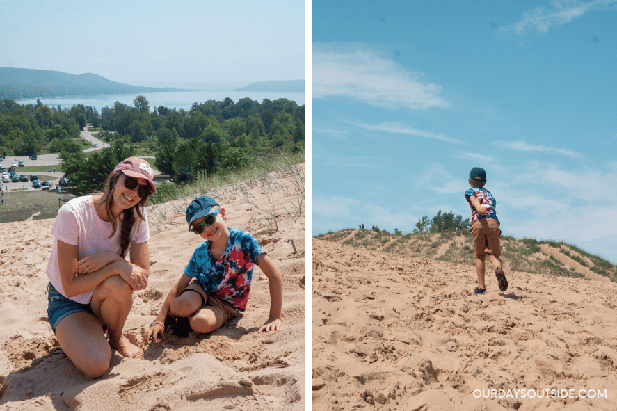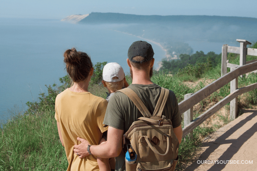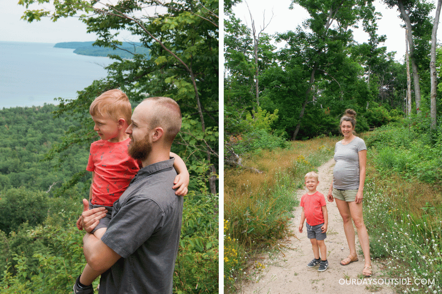 The hike is moderate with one decent climb through sand, but we managed it while I was six months pregnant with our almost four-year-old in tow. You’ll primarily hike through forest and end at the top of the hill with a view of Lake Michigan, the Manitou Islands, and coastline below.