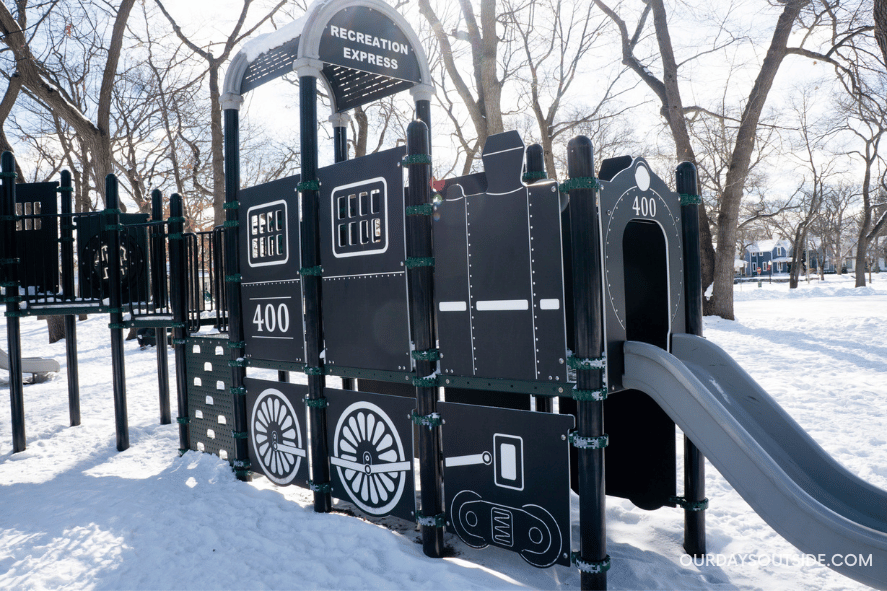 The playground is shaped like a train, which was an instant hit with our kids. There are picnic tables, a gazebo, and a lot of open space. As you can see, we like to visit no matter the season!
