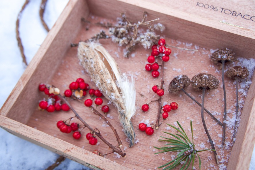There are berry branches with pops of red and orange, beautiful shades of evergreen, blue juniper berries, and of course, all the browns and grays of twigs, acorns, and old seed pods.