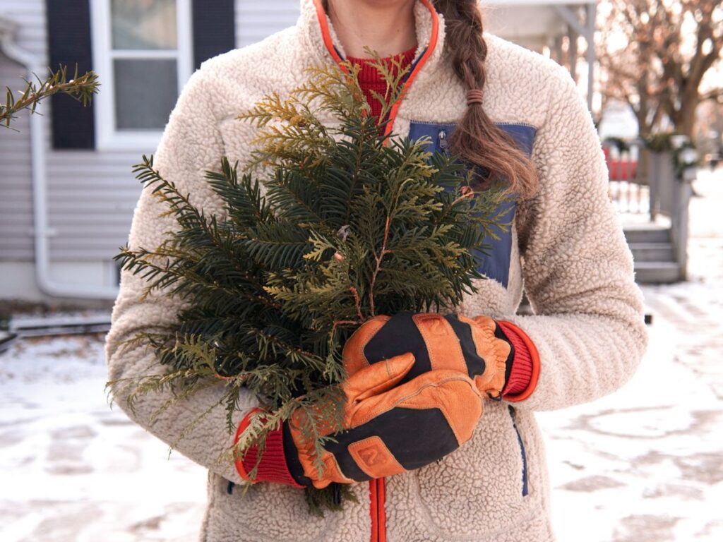 *A quick note on the types of evergreen branches you choose: In the past, I’ve found that spruce and fir branches don’t work as well since those get brittle quickly and all the needles fall off. Varieties of juniper, cedar, and pine all seem to work well. (Pull out your handy dandy tree identification guide on that one if ya need to.)