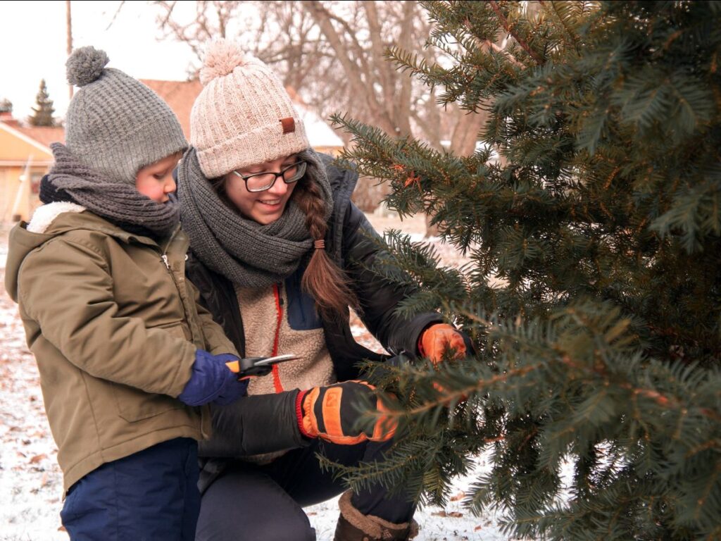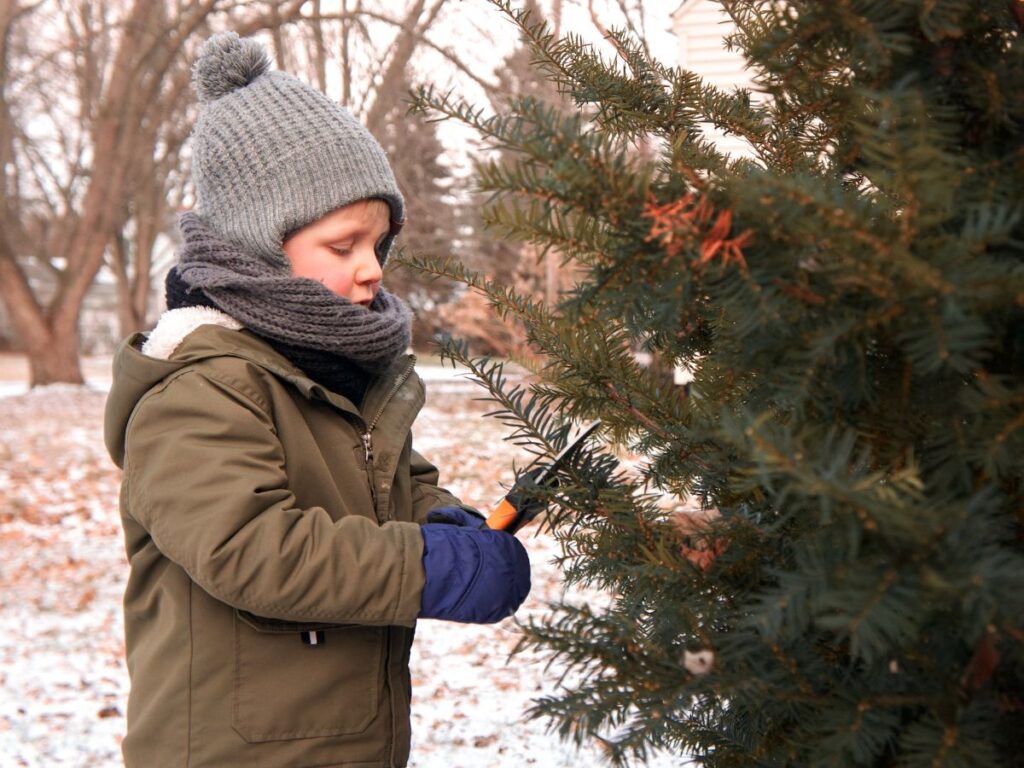 Fresh greenery is essential for the pretty packages we’re about to wrap! Head outside for a crisp walk or even just to the yard to get some clippings. I don’t know about your kids, but mine loves to get his hands on any adult tool that seems remotely dangerous, so he loved helping with this part. (No worries, we were safe. 😄)