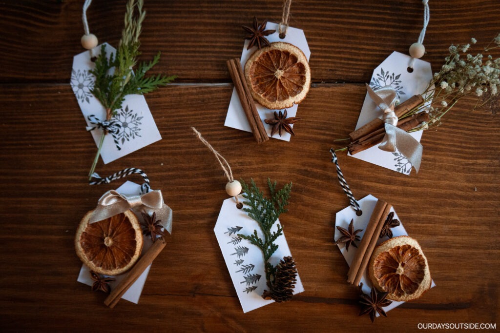Once you’ve obtained your greenery, set it aside for making the gift tags below! Or just tuck a small bundle underneath your ribbons after wrapping a package!