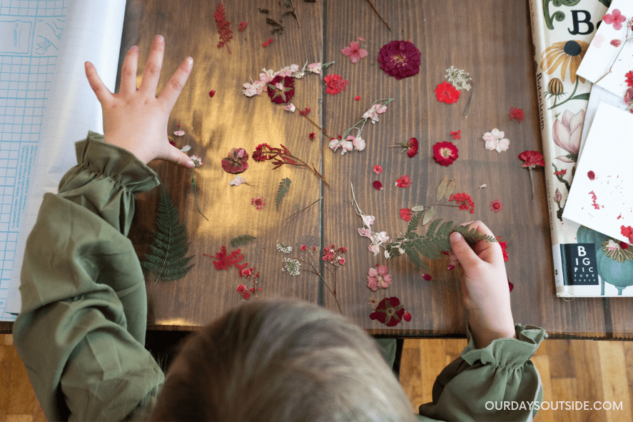 With something heavier like strawflowers, you’ll probably want to use a hot glue gun. But with smaller dried flower petals, younger kids could definitely help! Just have them paint a thick layer of mid lodge over the cardboard, then sprinkle on the petals!