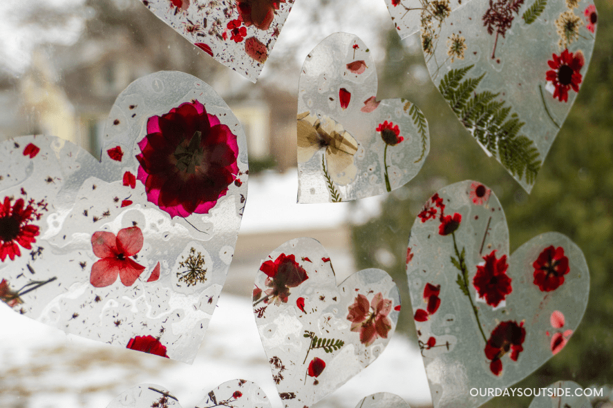 These heart sun catchers with pressed flowers make the prettiest decor for your windows! You can use them to make your own home festive or give them away as Valentines.
