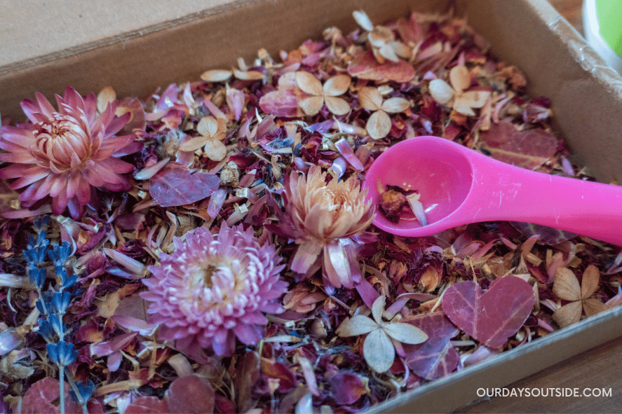 Make this gorgeous floral confetti for your Valentine’s gathering or to put inside of Valentine’s cards! This is one of our easiest Valentine’s Day nature crafts. Even young kids can help with this one and they’ll love the sensory experience of sifting through the confetti with their hands. A lot of the ingredients we used were dried from our own garden and yard, but they can also be purchased if you don’t happen to have them on hand. Feel free to add anything you’d like, but here’s what we used: