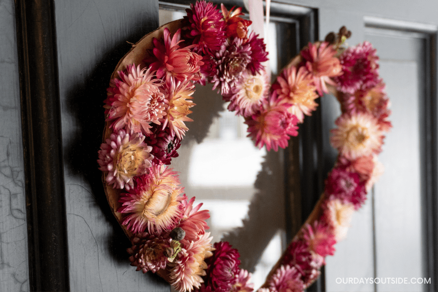The last of our Valentine’s Day nature crafts is a decoration that can be used over and over again! Simply cut out the shape of a heart on cardboard (I just googled free printable heart shaped templates to help me out) and glue on dried florals of your choice! You can use dried rose petals, lavender, baby’s breath, etc. I happened to have strawflowers that I grew and preserved from my own garden two summers ago!