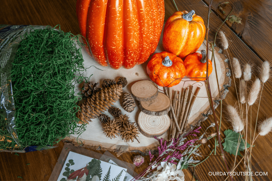 Now comes the fun part—decorating! Use moss and dried flowers around doorways and windows. Add miniature Halloween figurines and a tiny graveyard. Wrap grapevine around your pumpkin like enchanted vines. Tuck in pine cones as miniature “bushes.” The more creative, the better—this is where your fairy house really shines!