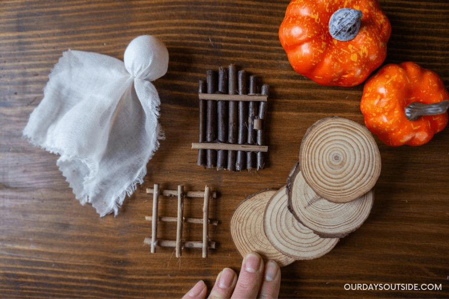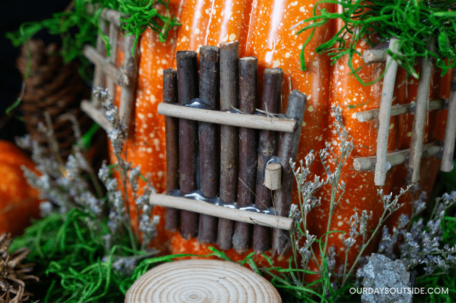Begin by crafting all the little details for your fairy home. Glue twigs together to form windows and doors, stack small wood slabs into stairways, or arrange bark into fences. These small touches bring your pumpkin fairy house to life.
