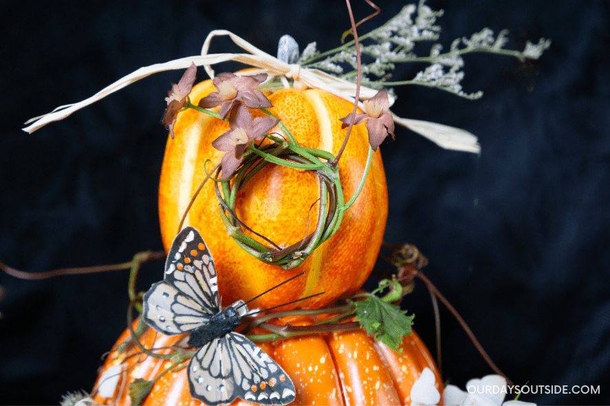 Tip: If you want a stacked pumpkin home, remove the stem from the bottom pumpkin and glue them together for a tiered fairy tower.
