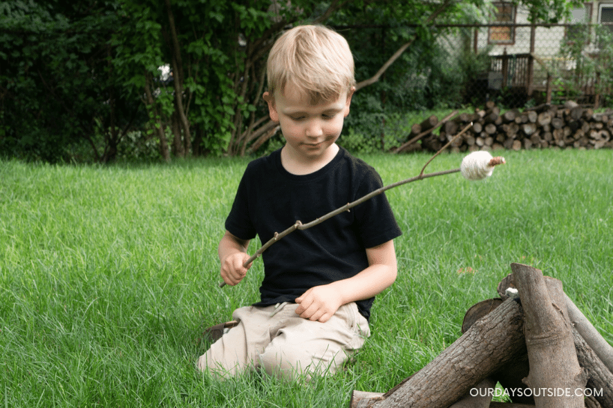 This idea spawned completely from the mind of my son. He entertained himself one day by stacking up logs in a teepee formation for his “fire” and pretending to roast marshmallows on it. Sometimes just the imagination of a child is enough, folks! When I saw how much fun he was having, I put a candle on top of his stack and lit it for him, then read him a few camp themed books while sitting by the “fire”.