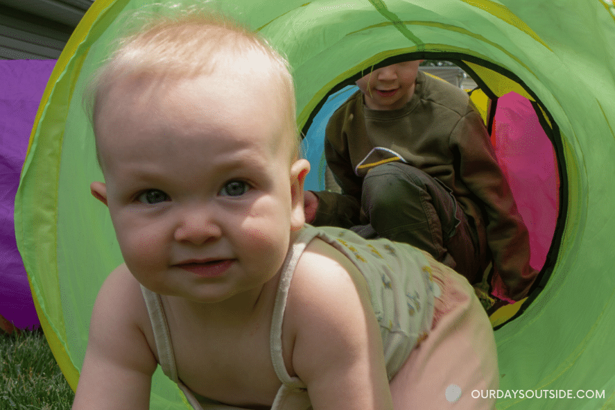 Use whatever materials are around (natural and man-made) and have the kids create things to jump over, climb on, crawl through, etc. We love this tunnel and these stepping stones. Half of the fun for my son is the actual set-up. And, of course, you have to pretend that the floor is lava ๐ .