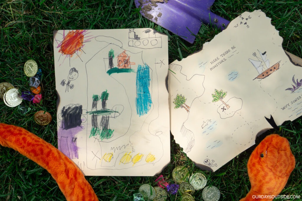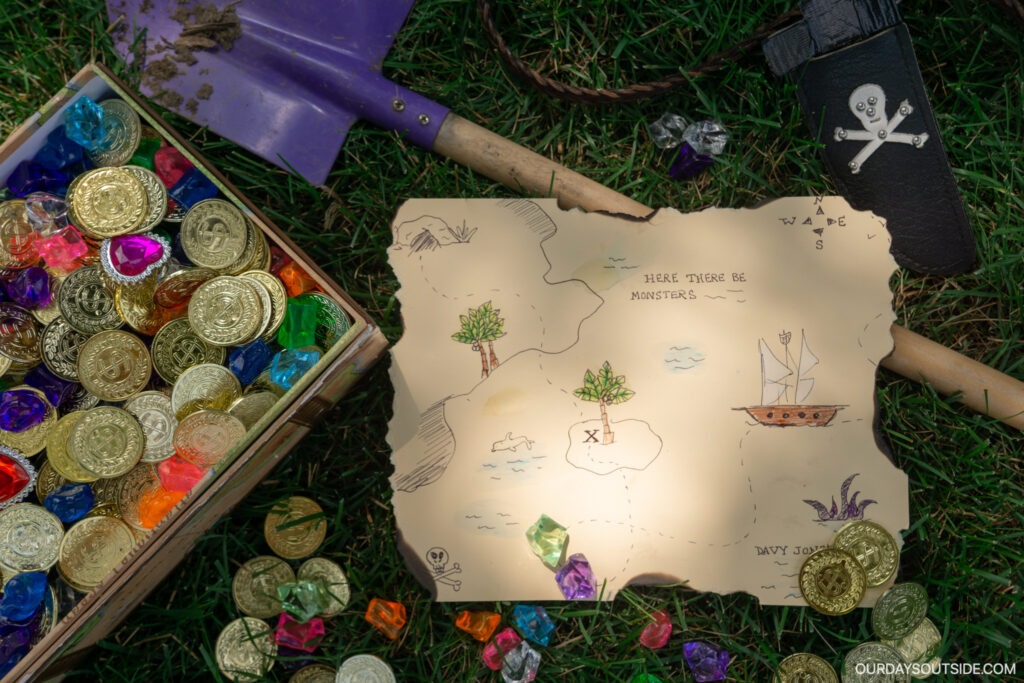 The second option for your treasure hunt is to draw or purchase a more authentic looking pirate map that doesn’t really mirror your yard. It’s more of a fun prop that helps you imagine your yard is that place! We used some yellowed paper and drew pirate-y things like desert islands, palm trees, sea monsters, and an X to mark the spot. Then we tore the edges and used a lighter to burn them a bit. If your kids are anything like mine, they’ll love this part!