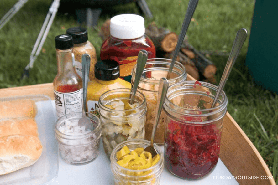 Arrange a platter of buns, brats, and extra fun toppings like these for easy campfire hot dogs. (Roasted over the fire, of course!)
