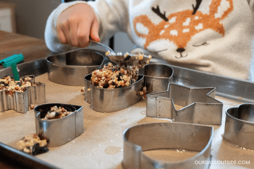 Line a baking sheet with parchment paper. Arrange cookie cutters of your choice (hearts are perfect for Valentine’s Day!) on the parchment paper. Lightly spray the inside of each cookie cutter with cooking spray so that the feeders will slide right out later.