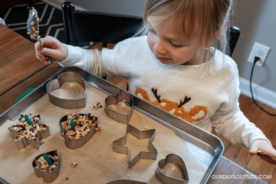 Once the bird feeders are firm, gently remove them from the cookie cutters. Thread twine or ribbon through the hole made by the straw and tie it into a loop. Now your Valentine’s Day bird feeders are ready to hang outdoors!