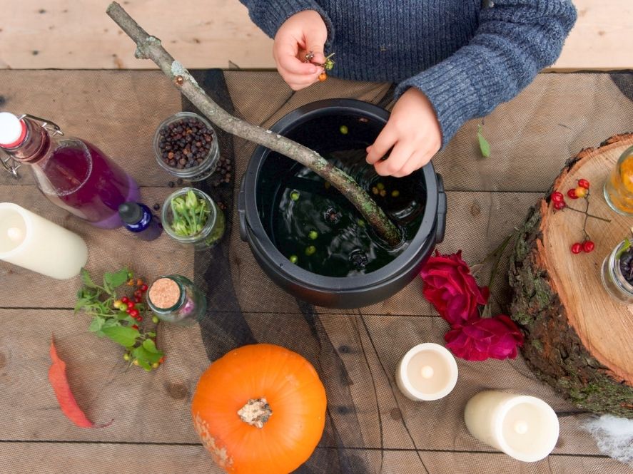 halloween activities for kids, close up of cauldron filled with flower petals, berries, and leaves
