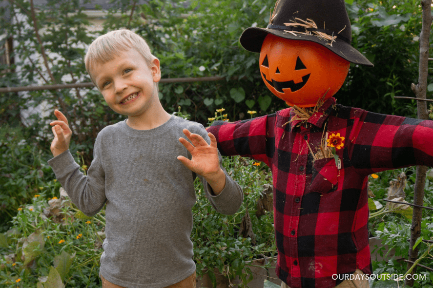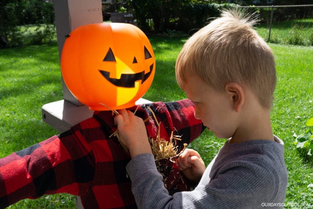 We added a few more touches to finish off our diy scarecrow, like some straw tucked into the hat, a flower tucked into the pocket, and an old hat that we glued to the jack-o-lantern head. Now he has a place in our garden and Finn promptly named him “Scary”.