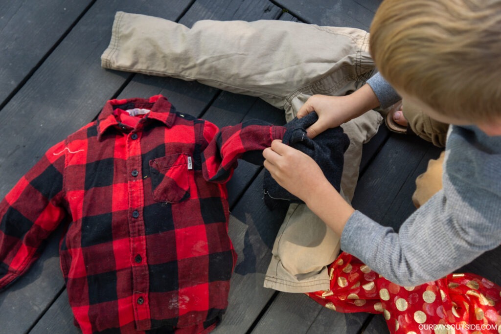 To get your DIY scarecrow started, stuff the old clothes with fabric, plastic bags, or whatever you choose as your stuffing. You can, of course, go traditional and use hay all the way through. We chose old fabric because that’s one thing I have plenty of! Not to mention you’re avoiding the majority of the mess 😜.