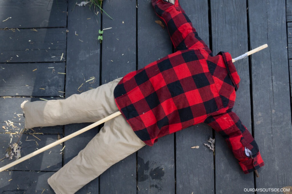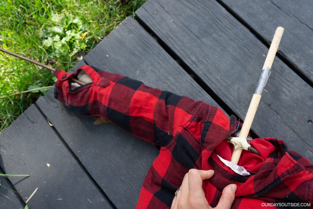 To make the scarecrow stand up, place the tallest post up through the back of the scarecrow’s shirt and out the neck hole. I initially used a 3 foot dowel, but that ended up being a bit too short and flimsy.