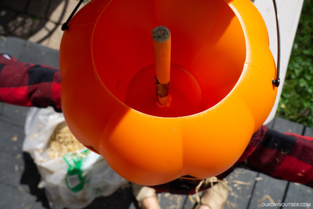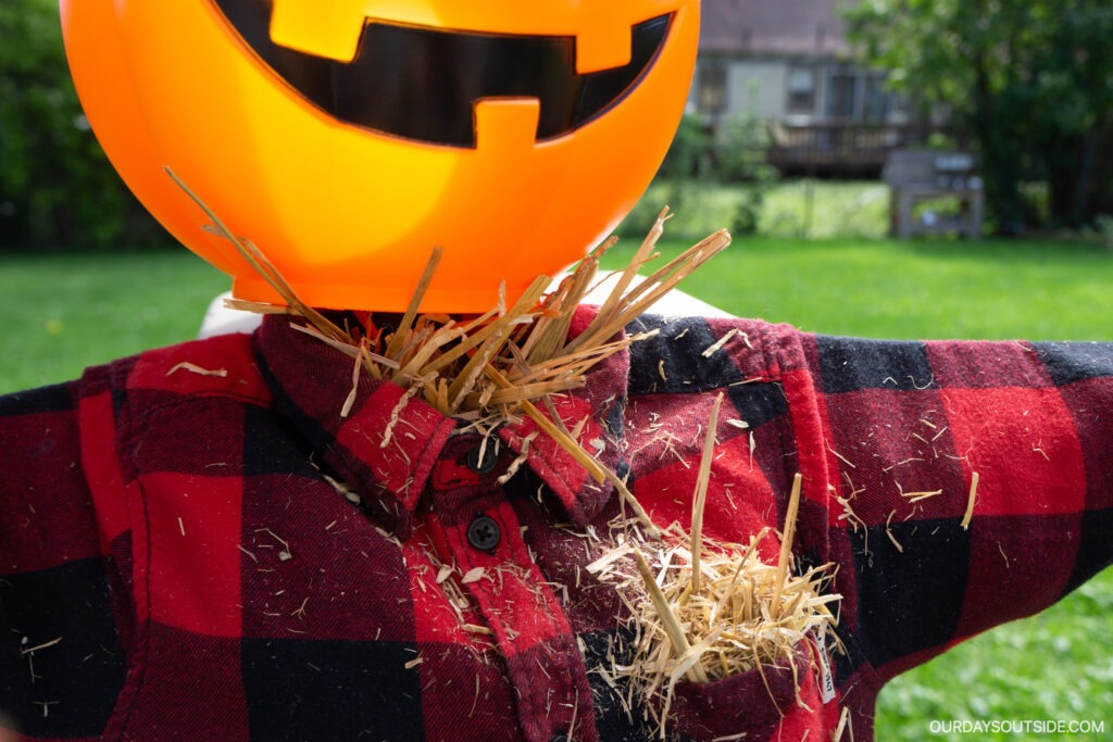Next, it’s time to stuff hay into the neck and pockets of our scarecrow to make it look more authentic. We used straw that was leftover from seeding our lawn in the summer, but I wouldn’t recommend that as the pieces were very small and didn’t stay in place super well. In retrospect, I would use this craft straw as it would work much better and be a lot less messy.